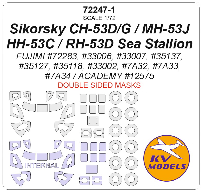 KV Decals - 1/72 Sikorsky CH-53D / CH-53G / MH-53J / HH-53C / RH-53D Sea Stallion mask for Academy AC12575 / Fujimi Part72283, Part33006, Part33007, Part35137, Part35127, Part35118, Part33002, Part7A32, Part7A33, Part7A34 Double sided wheels and canopy frame paint masks Academy / Fujimi