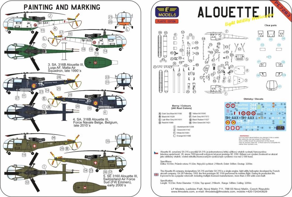 LF MODEL - 1/72 Alouette III Light utility helicopter, 5x camouflages France, Switzerland, Spain