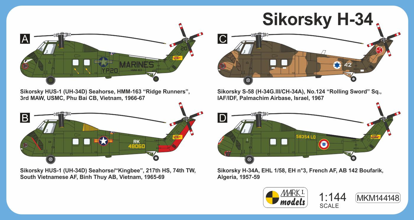 Mark I Models - 1/144 Sikorsky H-34 'In Combat' 1 kit included, boxed. (Because of external differences this is a new tool model and not the earlier Westland Wessex kit re-boxed)