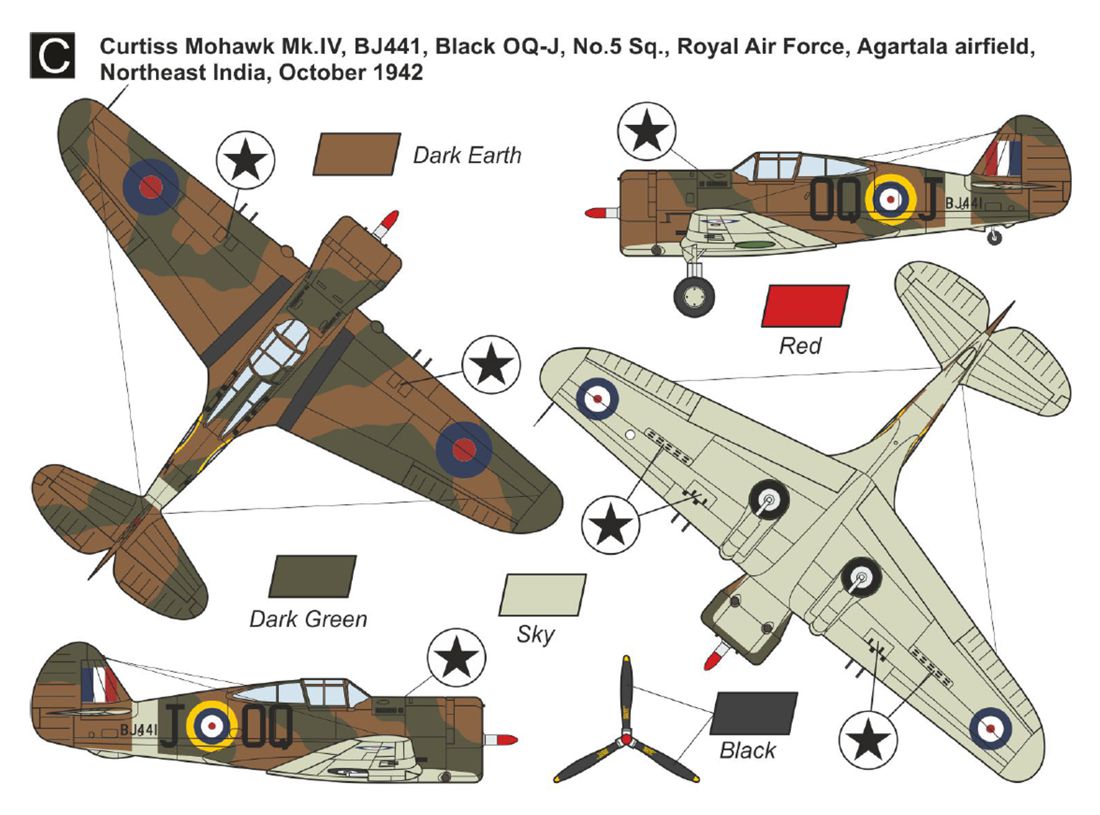 3 Curtiss Mohawk Mk.IV, BJ441, Black OQ-J, No.5 Sq., Royal Air Force, Agartala airfield, Northeast India, October 1942