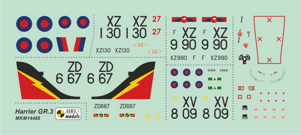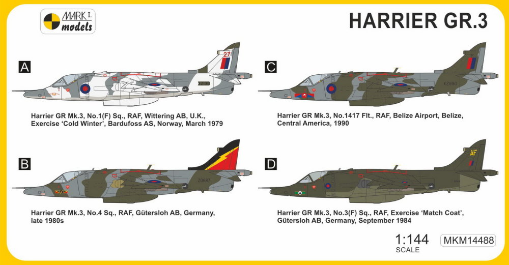 Mark I Models - 1/144 BAe Harrier GR.3 'Laser Nose' The Hawker Siddeley Harrier ?Jump Jet? is a British V/STOL aeroplane developed in the 1960s. The initial version was the Harrier GR.1, based on the P.1127 (RAF) fighter, and its upgraded variant was the GR.1A. Another upgrade implementing more powerful and reliable engine resulted in the GR.3 model, at first externally similar to previous GR.1/1As. Beginning from the spring of 1976 upgraded avionics were fitted to GR.3s comprising the laser range finder in a lengthened nose cone and tail warning devices housed in the fin and tail cone. A total of 40 Harriers Gr Mk.3s were built anew, with last delivered in late 1986, and about 62 were converted from the existing GR.1/GR.1As.