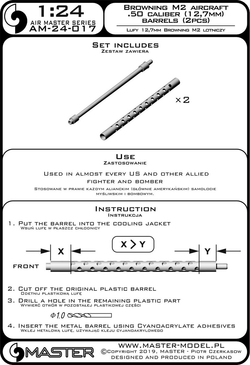 Master (PL) - 1/24 Browning M2 aircraft .50 caliber (12.7mm) barrels (x 2 pcs) (for Airfix, Kinetic Model and Trumpeter kits)