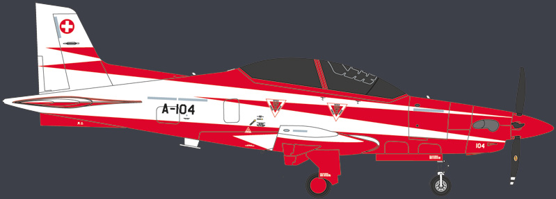 While the first 6 PC-21 carried a striking red and white scheme, visibility of the aircraft was deemed unsatisfactory - the follow up aircraft were painted all red with white trim. In time, all six PC-21 were painted in the same manner. A further exterior modification are the black leading edges of the wings and stabilizers. The landing gear, wheel wells and inside of the gear doors are painted white, as well as all antennas. The cockpit canopy has a black trim. As a general note-SAF PC-21 are glossy painted and kept in impeccable clean condition.
