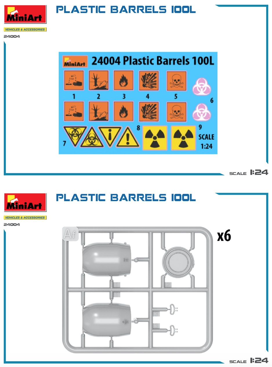 MiniArt - 1/24 Plastic barrels 100l this kit has six detailed plastic barrels. each barrel looks very real with nice textures and markings. decals are included to add more detail. these barrels are perfect for your dioramas and vehicle models.