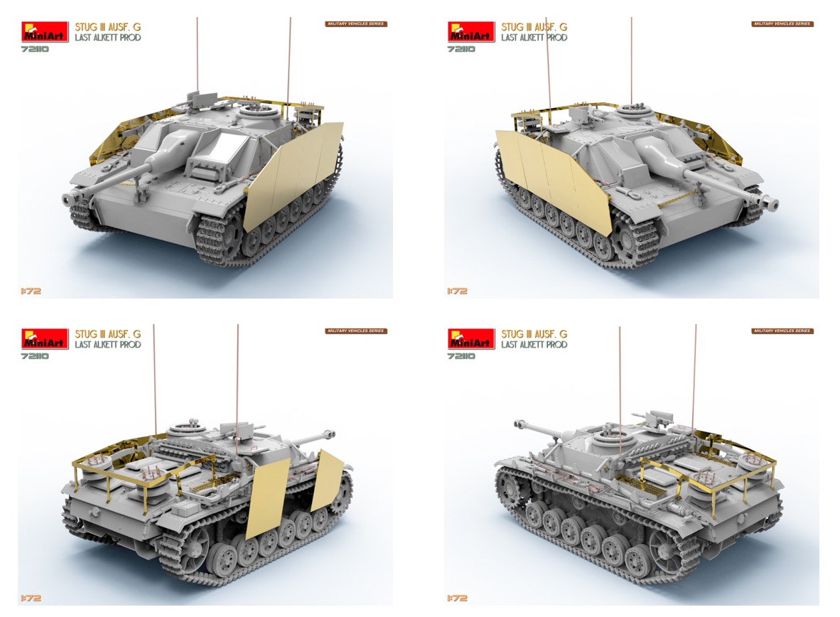 MiniArt - 1/72 Stug III Ausf.G Last Alkett Production bThis 1:72 scale model kit features the StuG III Ausf. G, representing the last production series by Alkett during World War II. Known for its reliability and firepower, this self-propelled gun played a significant role in the later stages of the war.