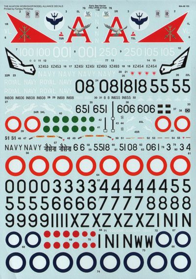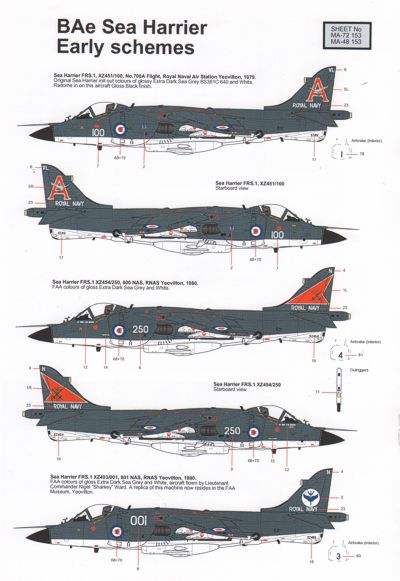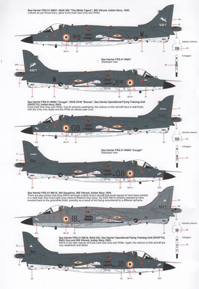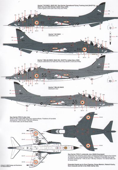 Model Alliance - 1/48 BAe Sea Harrier FRS.1 (9) XZ451/100 700A Flight 1976, XZ454/250800NAS 1980, xz483/001 801 NAS 1980, XZ453/105 899 NAS 1981. All NAS Yeovilton. Indian Navy IN601 W/606 INAS300 White Tigers INS Vikrant 1982, IN608/08 Cougar INAS 551B Bravos Op Flying Training Unit (SHOFTU) 2005, IN618/18 300 Squadron 1994, IN618/18 SHOFTU 2005, T-60 2-seaters IN651/651 INAS 552 SHOFTU 2005, IN055/55 INAS552 SHOFTU 2005