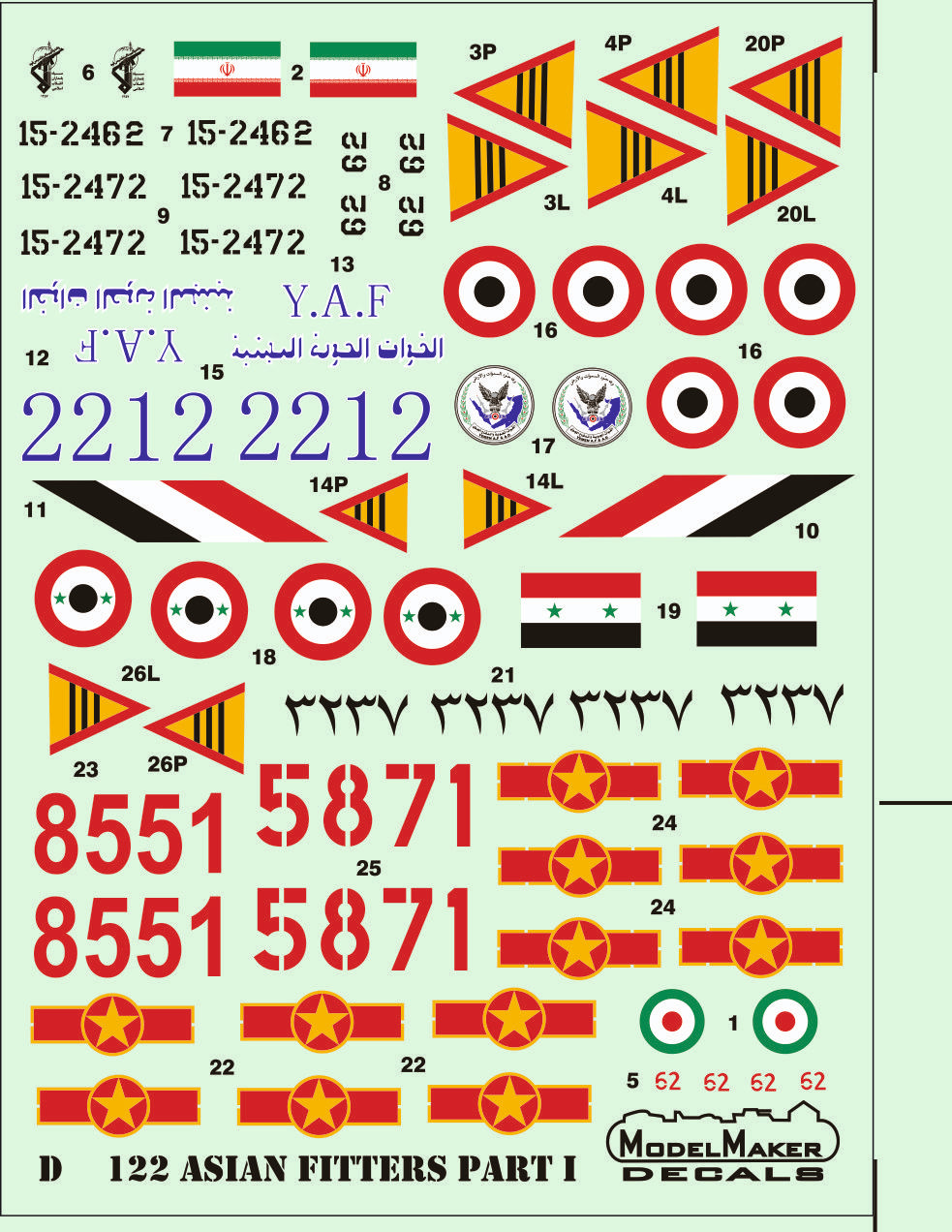 Model Maker - 1/72 Asian Fitters Part I including markings for Islamic Republic Of Iran Air Force x 2, Yemeni Air Force, Syrian Air Force, Vietnam Air Force x 2