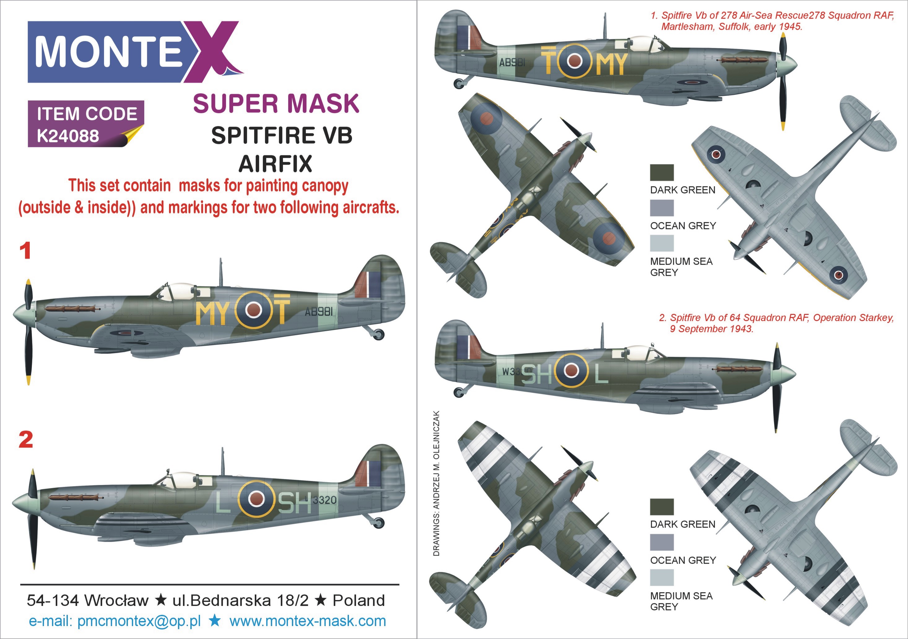 Montex - 1/24 Supermarine Spitfire Mk.Vb 2 canopy mask (outside & inside) + 3 insignia masks (for Airfix kits)