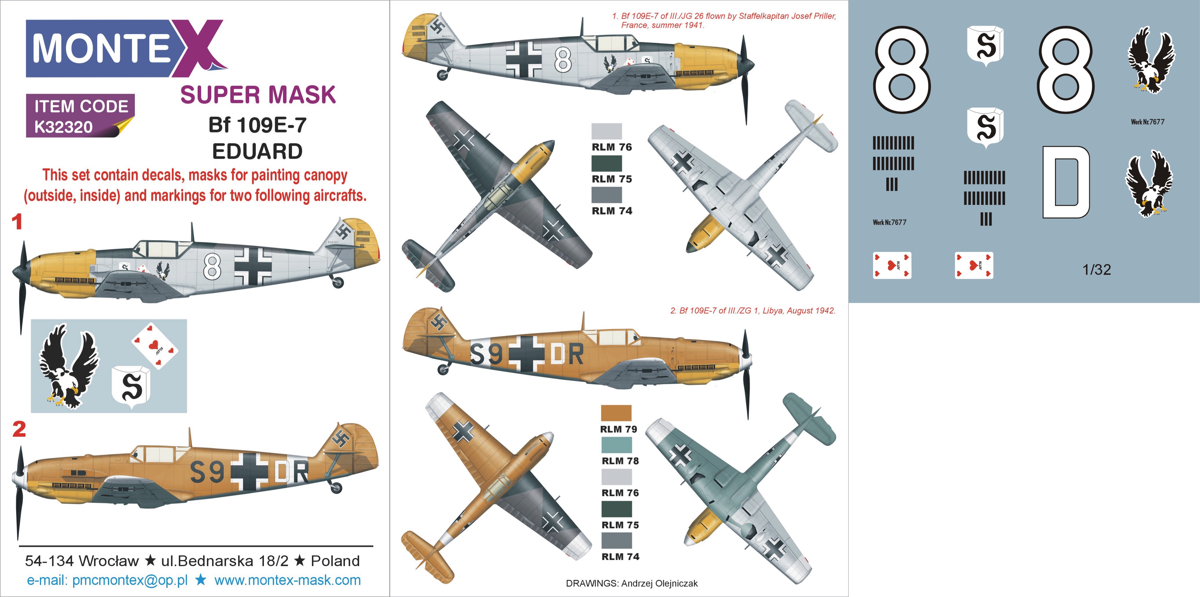 Montex - 1/32 Messerschmitt Bf 109E-7 (for Eduard kits) 2 canopy masks (outside and inside canopy masks) + 2 insignia masks + decals