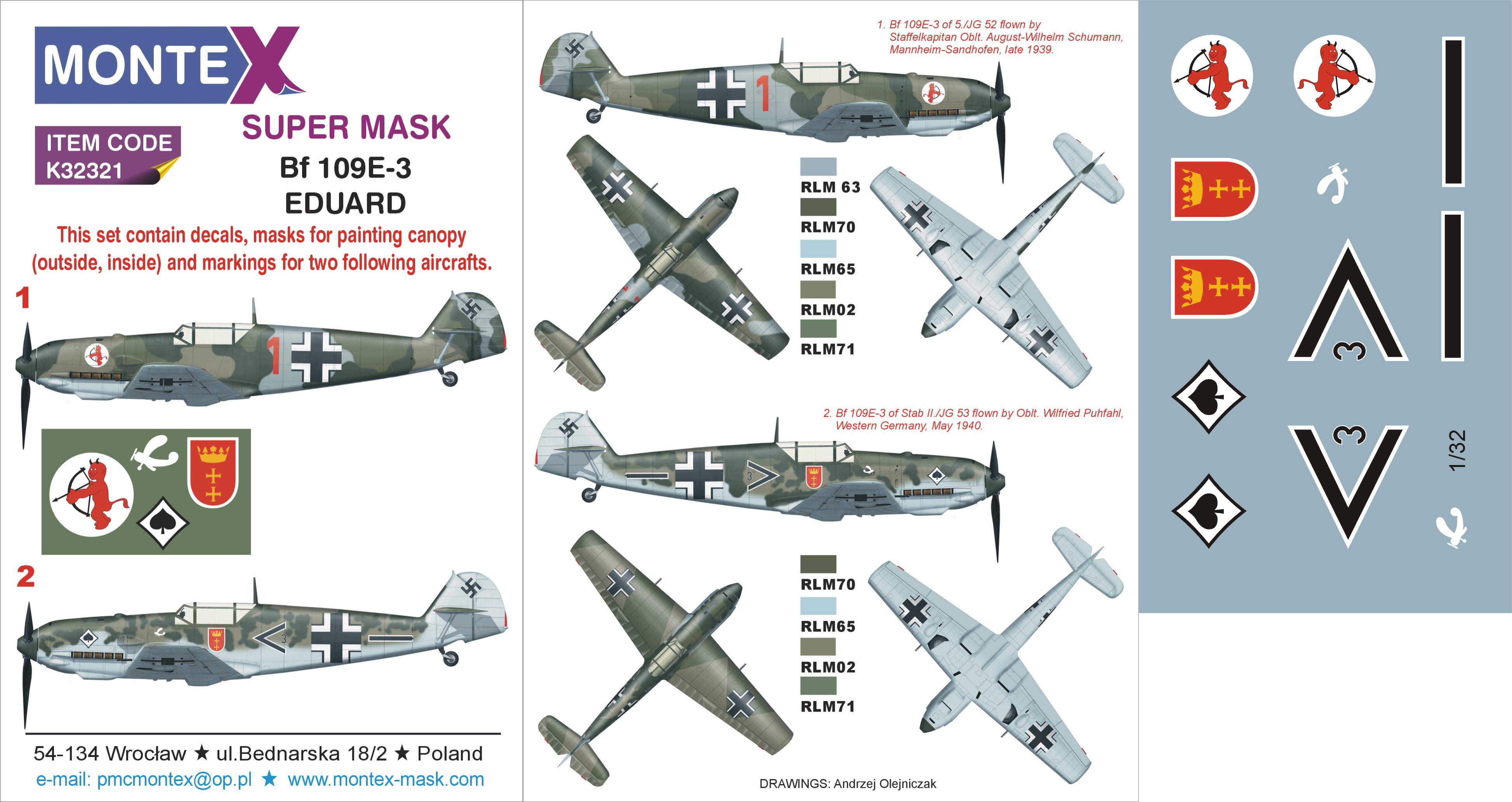 Montex - 1/32 Messerschmitt Bf 109E-3 (for Eduard kits) 2 canopy masks (outside and inside canopy masks) + 2 insignia masks + decals