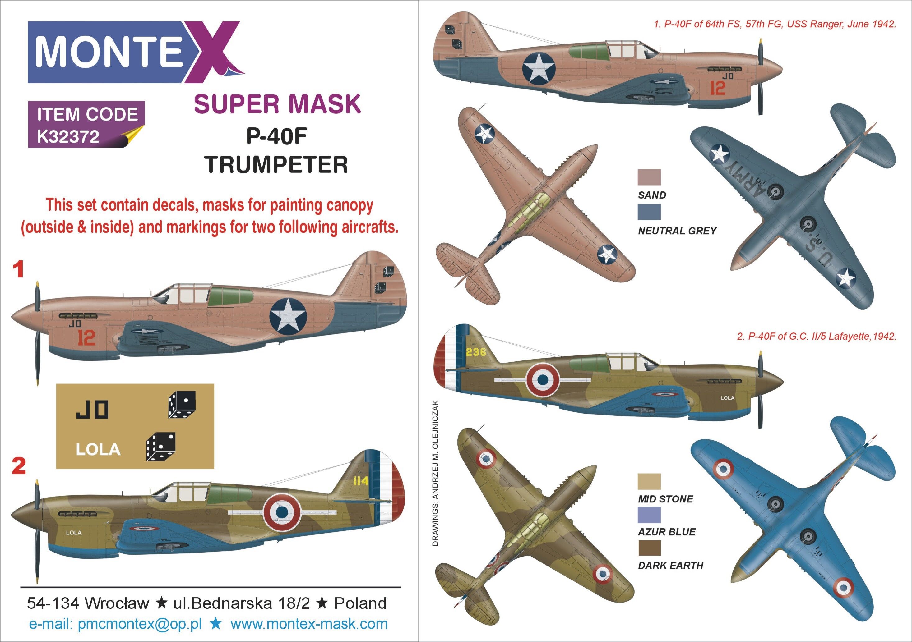 Montex - 1/32 Curtiss P-40F Warhawk canopy mask (outside & inside) + 2 insignia masks + decals (for Trumpeter kits)