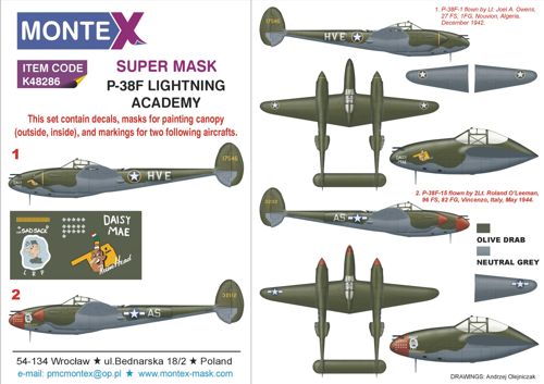 Montex - 1/48 Lockheed P-38F Lightning 2 canopy mask (outside & inside) + 1 insignia masks + decals (designed to be used with Academy kits)