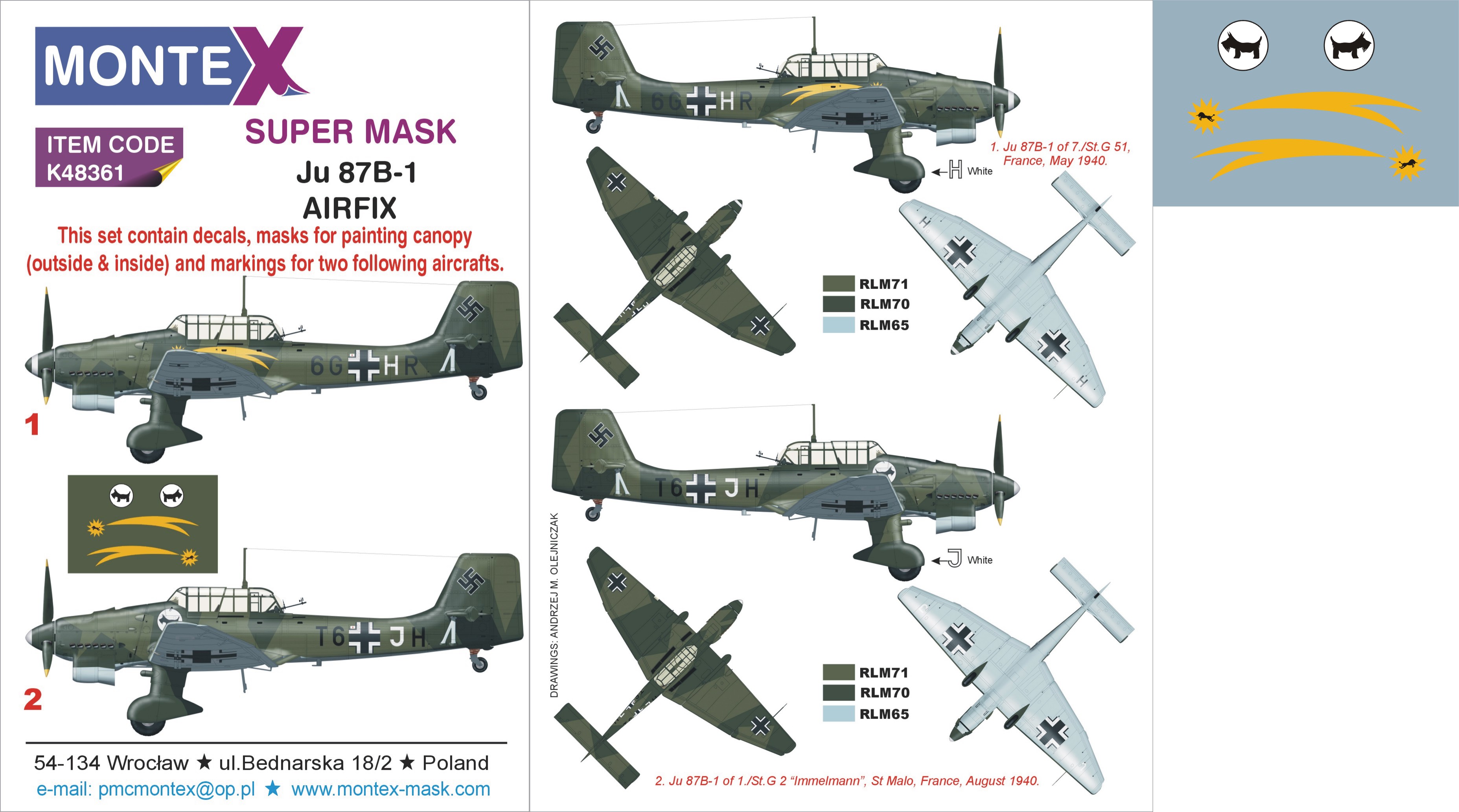 Montex - 1/48 Junkers Ju-87B-1 'Stuka' 2 canopy mask (outside & inside) + 1 insignia masks + decals (for Airfix kits)