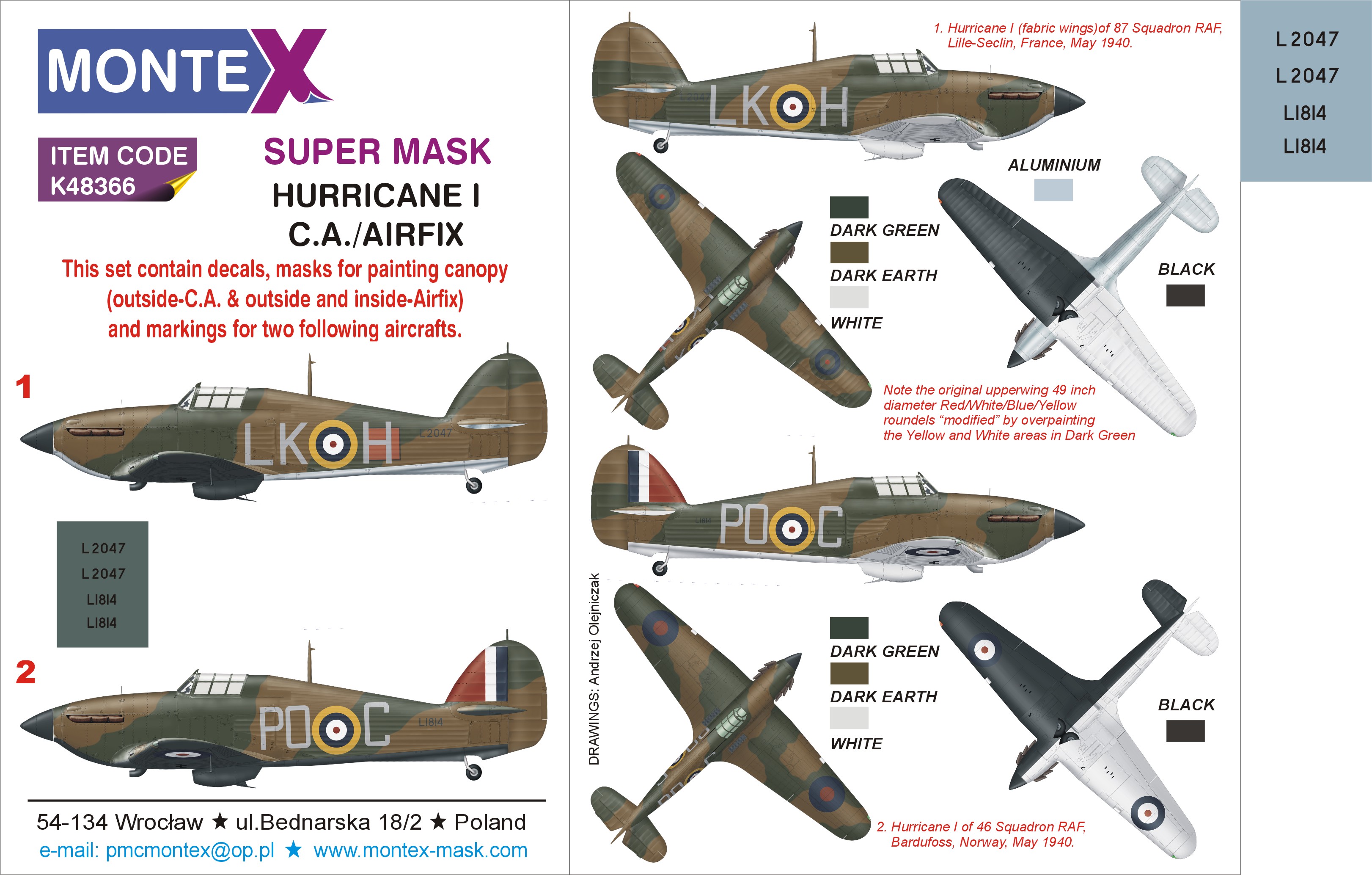Montex - 1/48 Hawker Hurricane Mk.I2 canopy mask (outside & inside) + 2 insignia masks + decals (for Classic Airframe and Airfix kits)