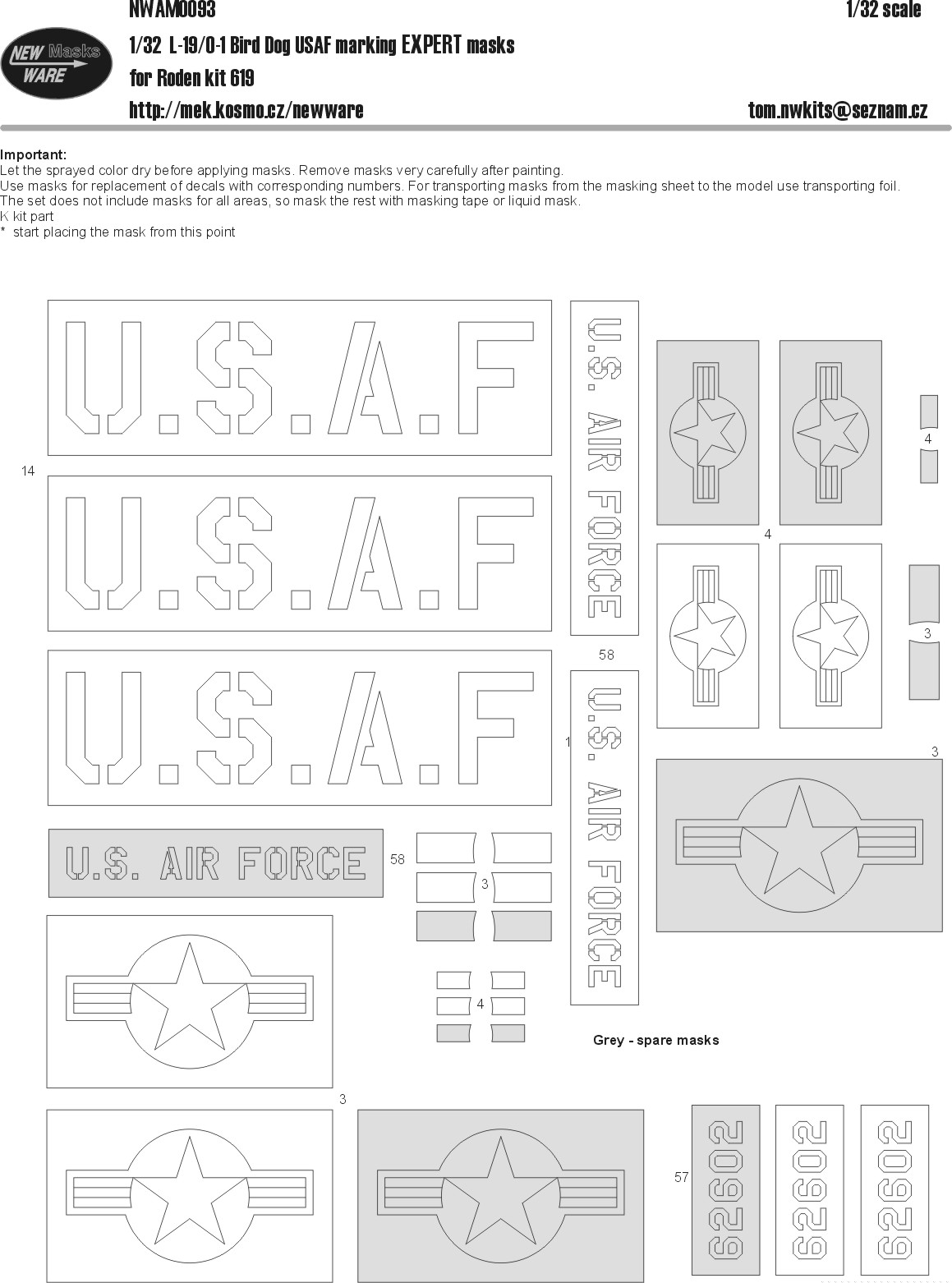 New Ware - 1/32 Cessna L.19/O-1 Bird Dog USAF marking EXPERT masks replacement of USAF, US AIR FORCE, 62602 and USAF insignia decals (for Roden kits)