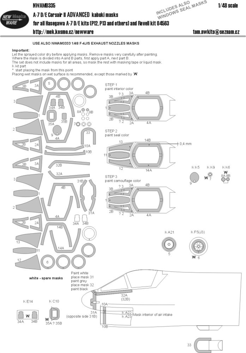 New Ware - 1/48 Vought A-7D/A-7E Corsair II ADVANCED (for Hasegawa kits) kabuki masks aircraft canopy including window seals, all other clear parts, wheels, air intake, anti-glare shield, nose, camouflage details