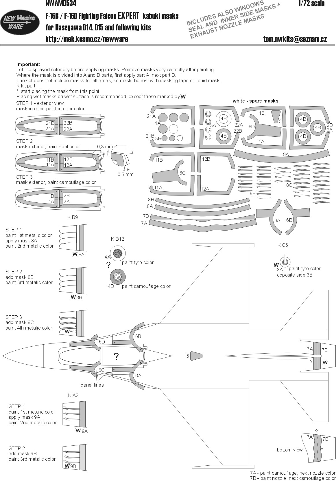 New Ware - 1/72 Lockheed-Martin F-16B/F-16D Fighting Falcon EXPERT kabuki masks aircraft canopy including seals and inner side masks, wheels, camouflage details, exhaust nozzle (for Hasegawa kits)