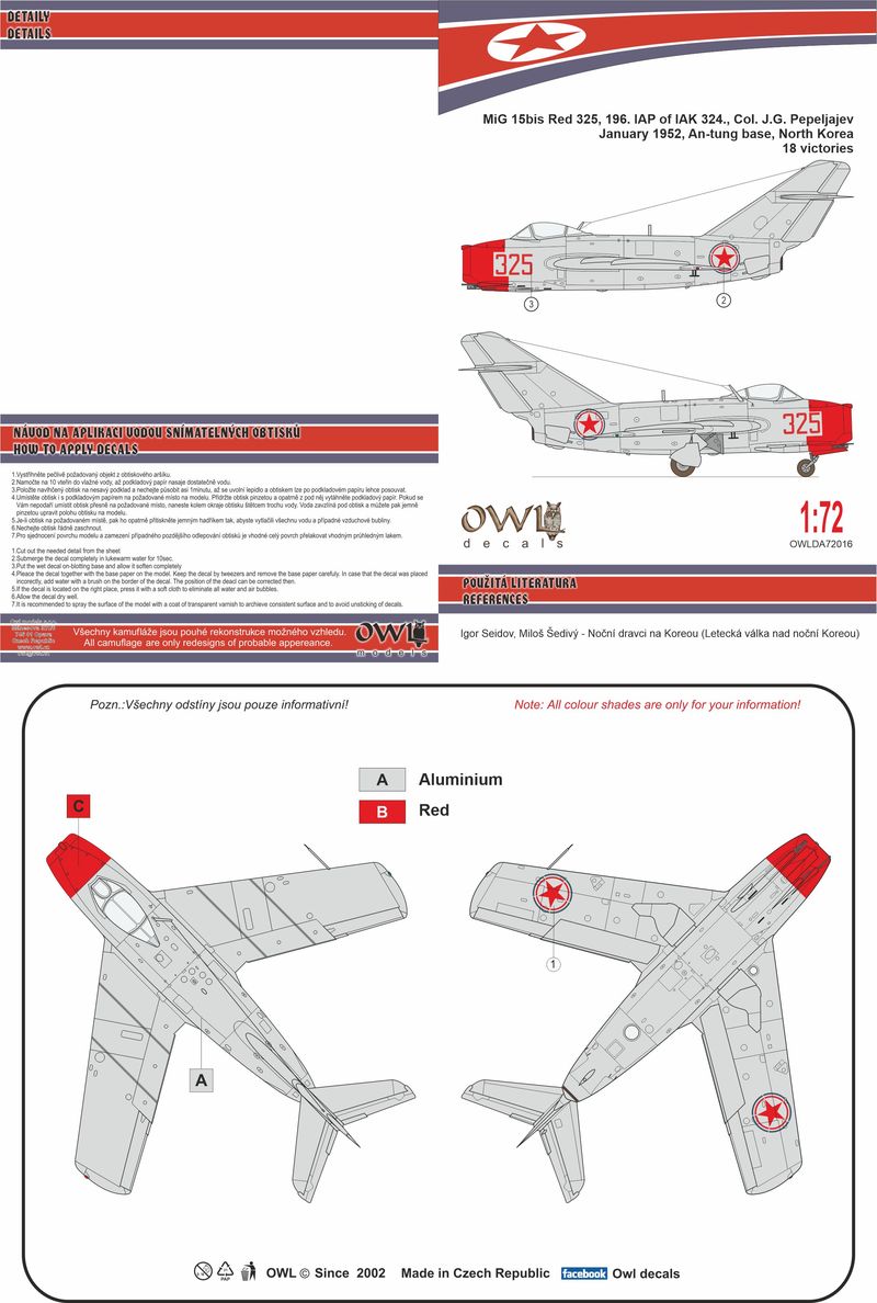 OWL Decals - 1/72 Mikoyan MiG-15 Korean fighter (J.G.Pepeljajev) 196. Iak Red 325
