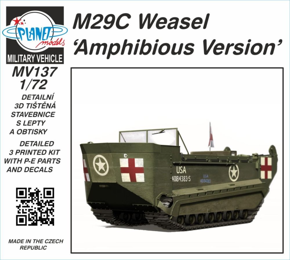 Planet - 1/72 M29C Weasel 'Amphibious Version' 3D-printed model set with etched details and a sheet of decals. This amphibious version of the US-built M29C Weasel tracked transport vehicle was used both in Europe and the Pacific Area during WW2, by American troops and Brits as well. The vehicles were also deployed to Korea and later used by the French in Vietnam.