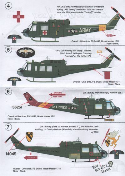 Print Scale - 1/72 Bell UH-1B/UH-1D Huey (11) C Troop 16th Cavalry, 227th Aviation Company Tiger Striped, 175th Aviation Company, 57th Medical Detachment, 116th Assault Helo Co, 1st Platoon Battery C, 3rd Platoon 'Razirbacks', 114th Ahc White Knights, 118th Ahc Thunderbirds, 155251 U.S. Marines, Usn HAL-3 Seawolves. All Vietnam.