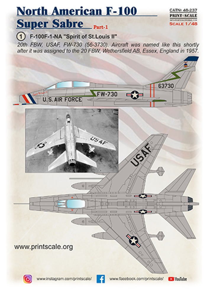 1. F-100F-1-NA 'Spirit of St.Louis II'. Unit: 20th FBW, USAF. Serial: FW-730 56-3730. Aircraft was named like this shortly after it was assigned to the 20 FBW, Wethersfield AB, Essex, England in 1957.
