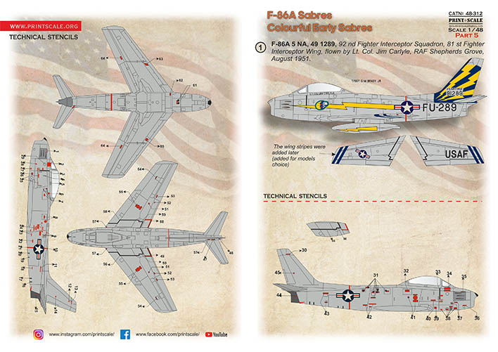 Print Scale - 1/48 North-American F-86A Colorful Early Sabres. The complete set 2 leaf. Part 5.F-86A 5 NA, 49 1289, 92 nd Fighter Interceptor Squadron, 81 st Fighter Interceptor Wing, flown by Lt. Col. Jim Carlyle, Raf Shepherds Grove, August 1951.