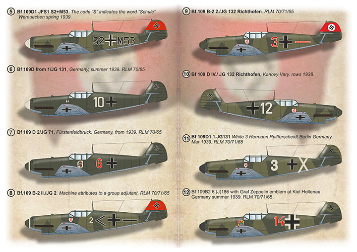 2. Bf 109B-2 Red 4 , unknown unit, 1937. Standard finish of Rlm 70/71/65 with a red spinner, fuselage number and tail band. Narrow style crosses in all six positions.