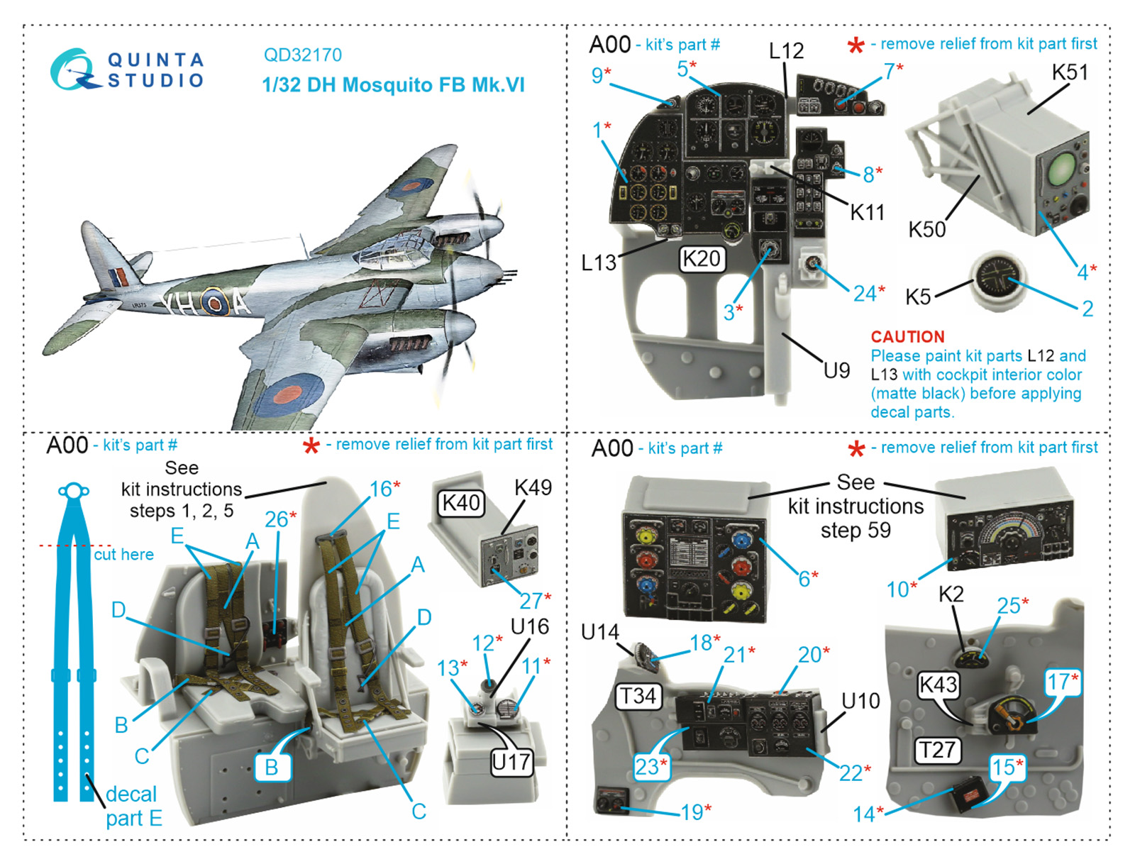 Quinta Studio - 1/32 De Havilland Mosquito Mk.VI 3D-Printed & coloured Interior on decal paper (designed be used with Tamiya kits)