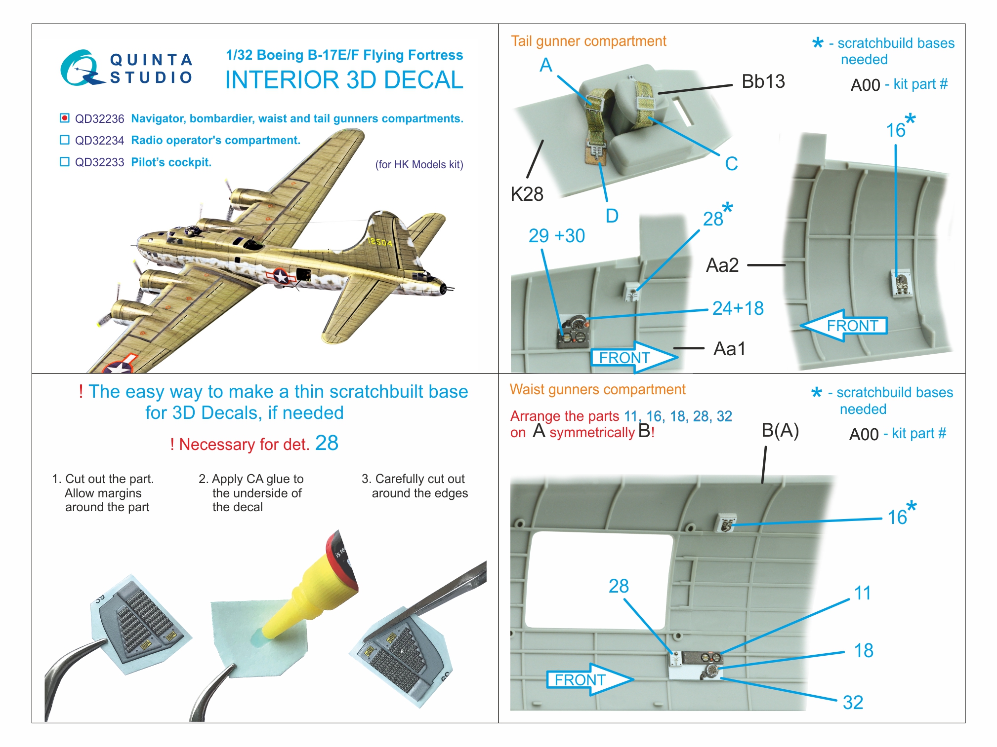 Quinta Studio - 1/32 Boeing B-17E/B-17F Flying Fortress Navigator, bombardier, waist and tail gunners compartments 3d-Printed & coloured Interior for Hong Kong Model