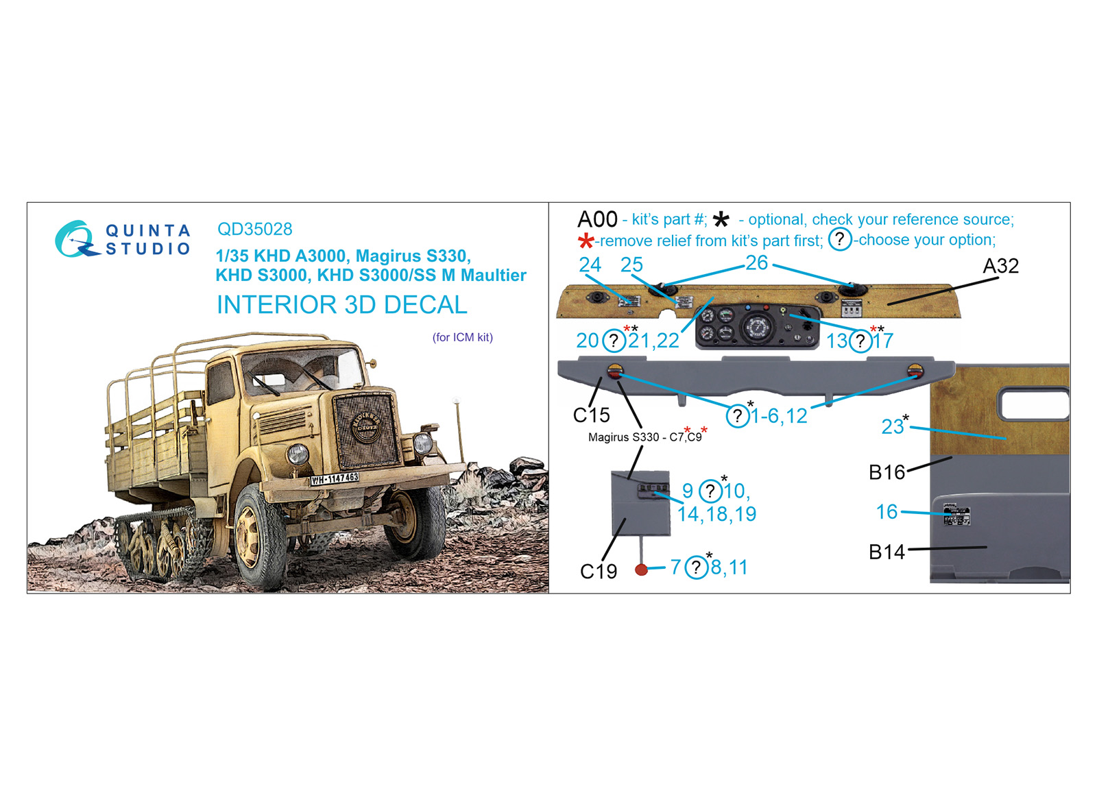 Quinta Studio - 1/35 Khd A3000, Magirus S330, Khd S3000, Khd S3000/SS M Maultier 3D-Printed & coloured Interior on decal paper (for Icm kits)