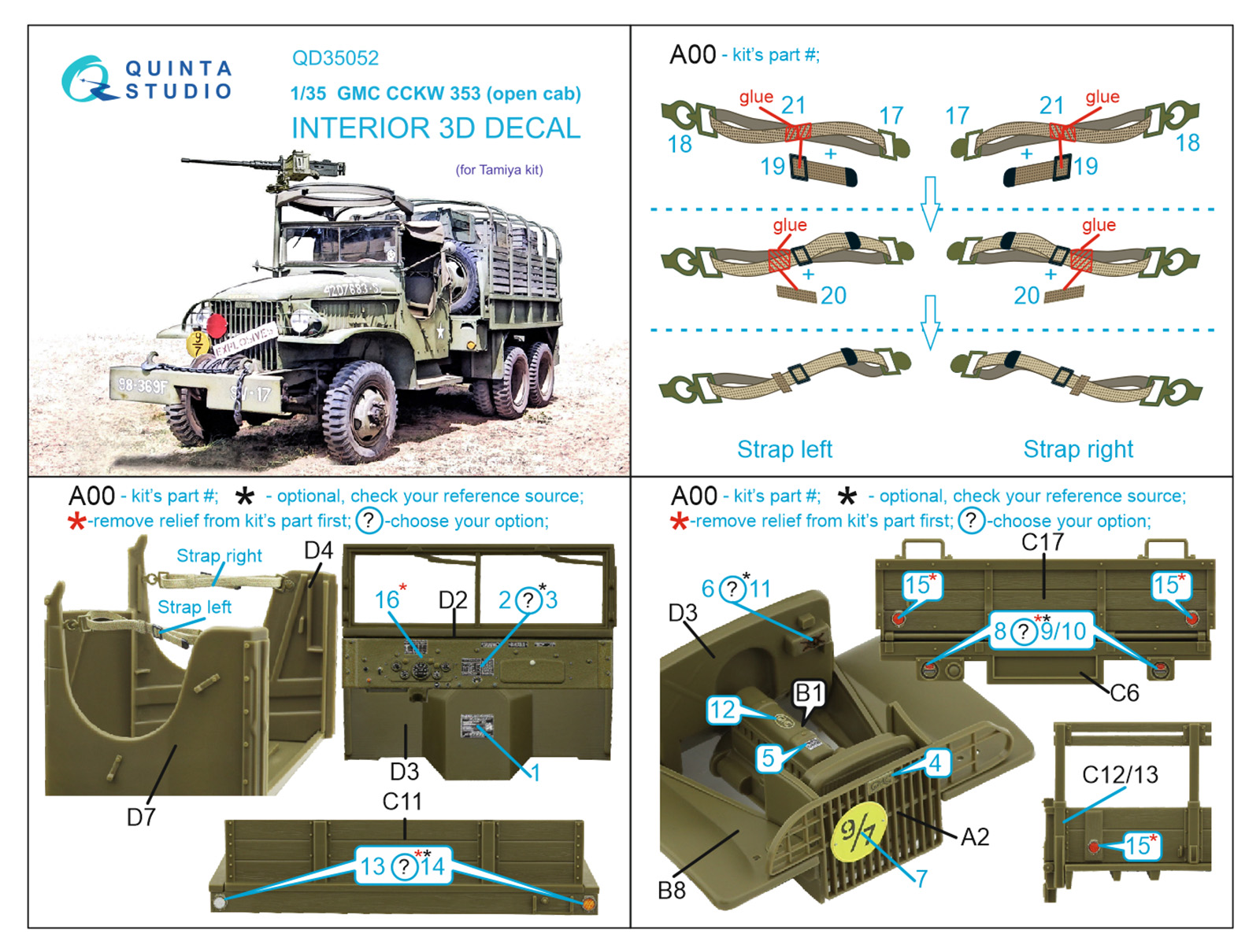 Quinta Studio - 1/35 Gmc Cckw 353 (for open cab kits) 3D-Printed & coloured Interior on decal paper (for Tamiya kits)
