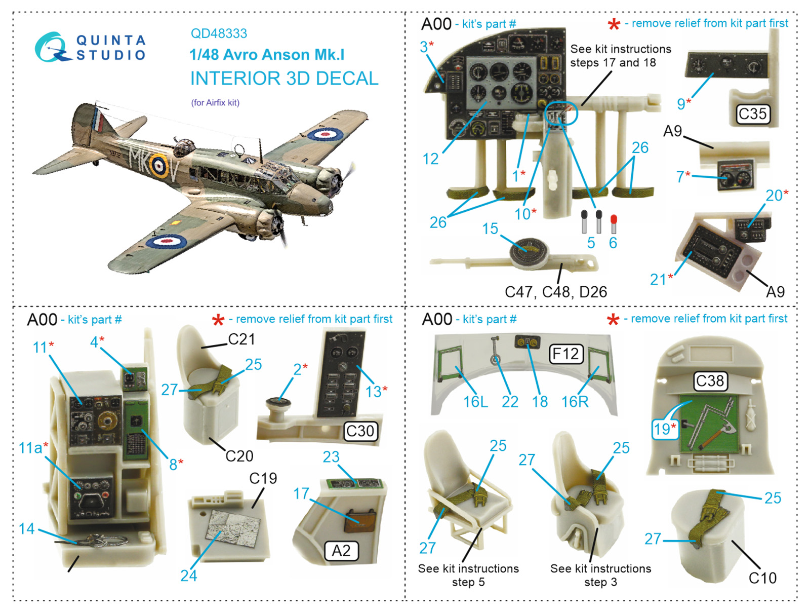 Quinta Studio - 1/48 Avro Anson Mk.I 3D-Printed & coloured Interior on decal paper (for Airfix kits)