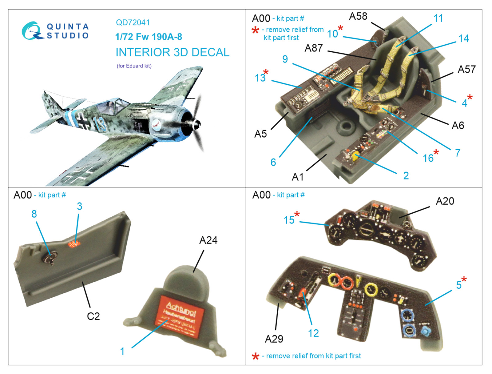 Quinta Studio - 1/72 Focke-Wulf Fw-190A-8 3D-Printed & coloured Interior on decal paper (for Eduard kits)