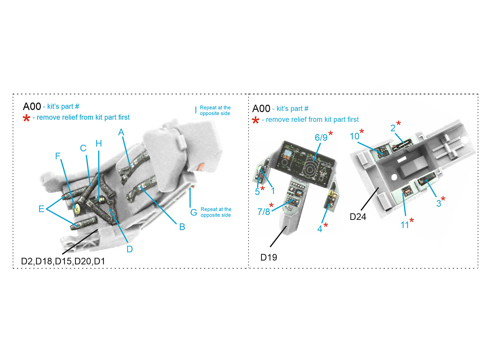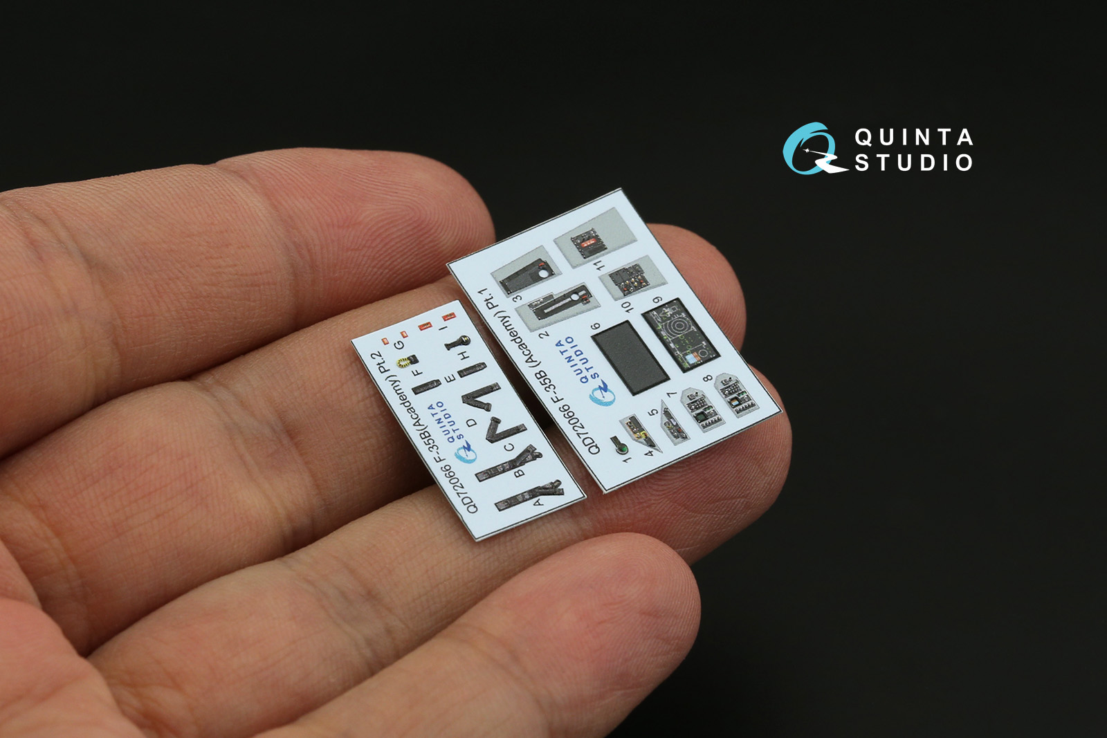 The set includes a set of pre-printed 3D decals that can be applied directly onto the kit's cockpit instrument panel and side consoles. These decals are highly detailed and feature a range of textures and shades, providing a realistic representation of the aircraft's cockpit.
