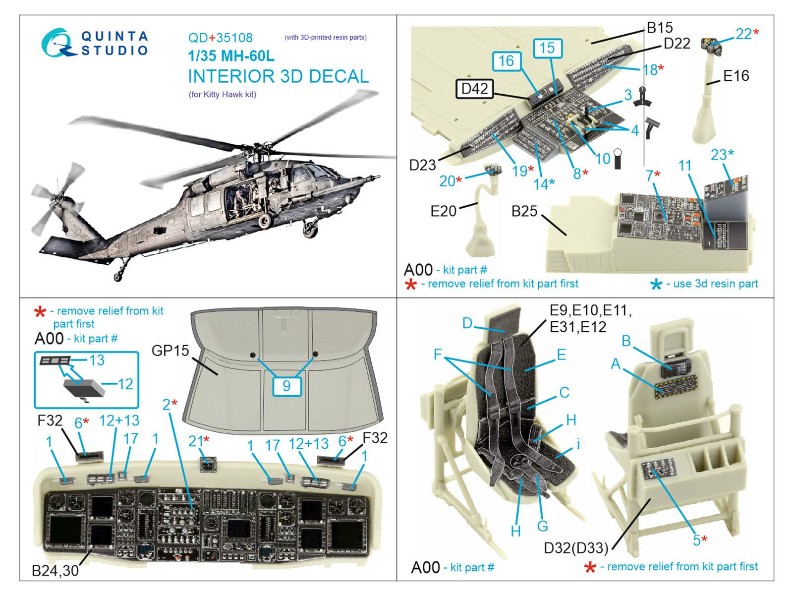 Quinta Studio - 1/35 MH-60L Interior on decal paper for KittyHawk for with 3D-printed resin parts