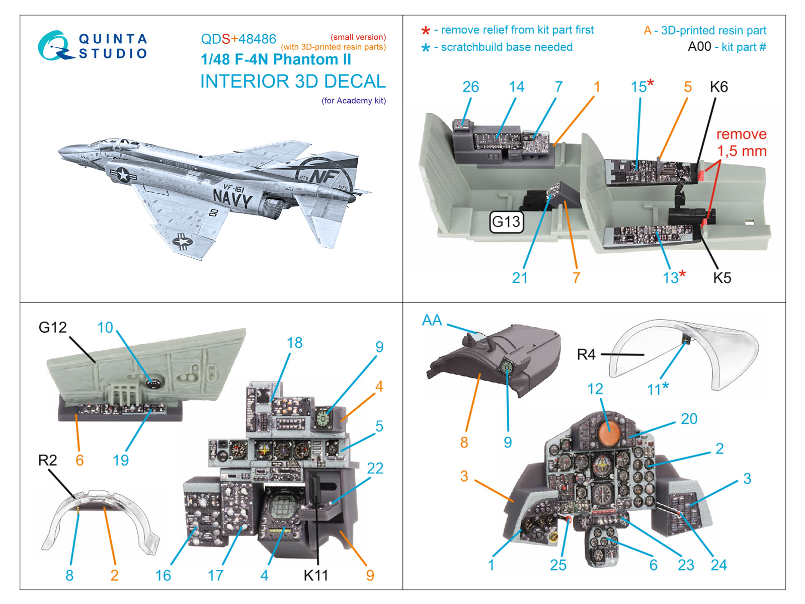 Quinta Studio - 1/48 McDonnell F-4N Phantom II 3D-Printed coloured Interiorfor Academy, Small version with 3D-printed resin parts