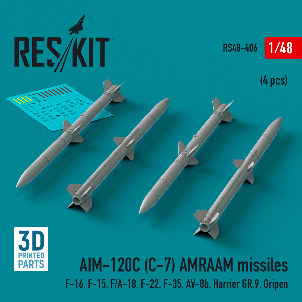 ResKit - 1/48 AIM-120C (C-7) Amraam missiles (4 pcs) (F-16, McDonnell F-15, F/A-18, Lockheed-Martin F-22, F-35, AV-8b, Harrier GR.9, Gripen) (3D-Printed)