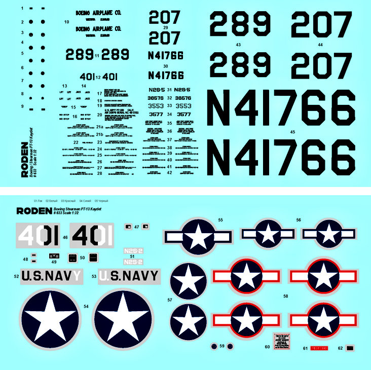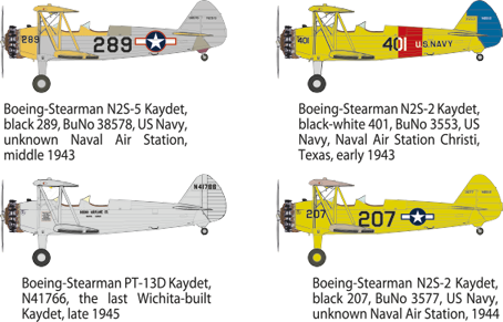 Marking for 4 aircraft: (1) N2S-5 Black 289, Usn 1943, (2) N2S-2 Black-White 401, Usn Nas Christi Texas 1943, (3) PT-13D N41766 1945, (4) N2S-2 Black 207 Usn 1944.