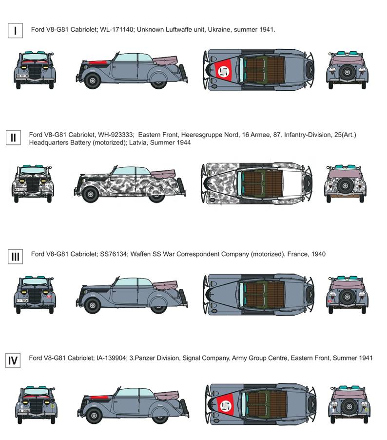 9 sprues. Choice of markings for 4 staff cars: (1) WL-171140, unknown Luftwaffe unit, Ukraine, Summar 1941, (2) WH-923333, Eastern Front, Heeresgruppe Nord, 16. Armee, 87 Infantry Div, 25(Art) Headquarters Battery (Motorised), Latvia, Summer 1944, (3) SS76134, Waffen Ss War Correspondent Company (Motorised), France 1940, (4) IA-139904, 3 Panzer Division, Signal Company, Army Group Centre, Eastern Front, Summer 1941. (Figures not included).