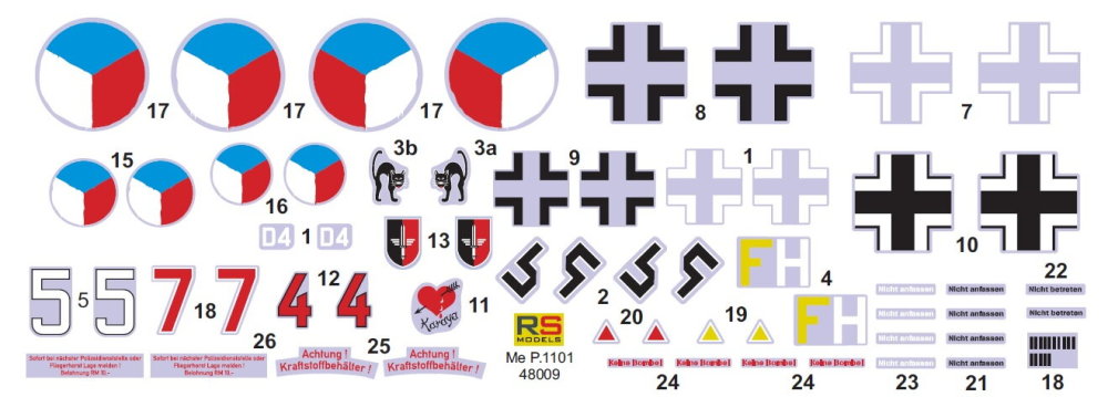 The Messerschmitt P.1101 was commissioned by Okl in the summer of 1944 and was the first aircraft in the world to have variable wing geometry. It could only be built on the ground at a yaw angle of 35° to 45°. 3 decal variants: