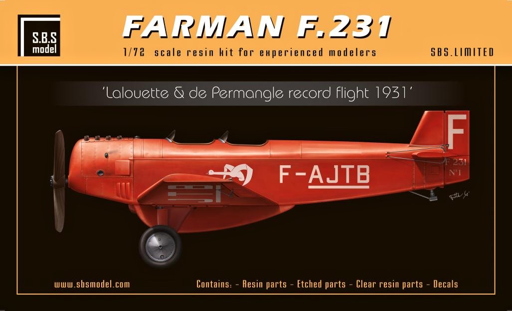 SBS Model - 1/72 Farman F.231 Lalouette & de Permangle with the oversized belly fuel tank. in 931 F-AJTB piloted by Lalouette & de Permangle flew nonstop from Istres, France, to Villa Cisneros, in colonial West Africa covering 2,700 km (1,690 mi) in 22 hours. Setting a new record at the time.