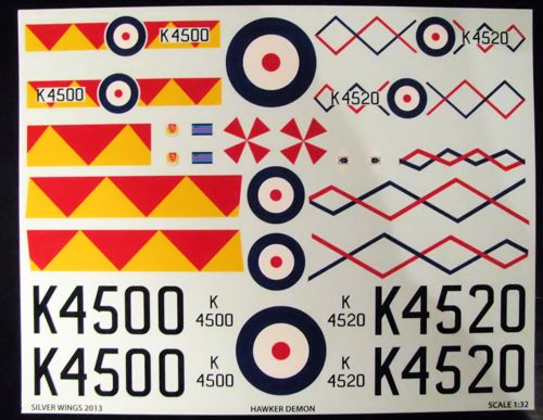 Silver Wings - 1/32 Hawker Demon. Kit includes: 130 resin parts, 92 p-e, film, reinforced wings & struts, instruction, decals RAF: Hawker Demon, K4520, 64 Squadron, Martlesham Heath, June 1937 RAF: Hawker Demon, K4500, 604 Squadron, Auxiliary Air Force, Hendon, 1936
