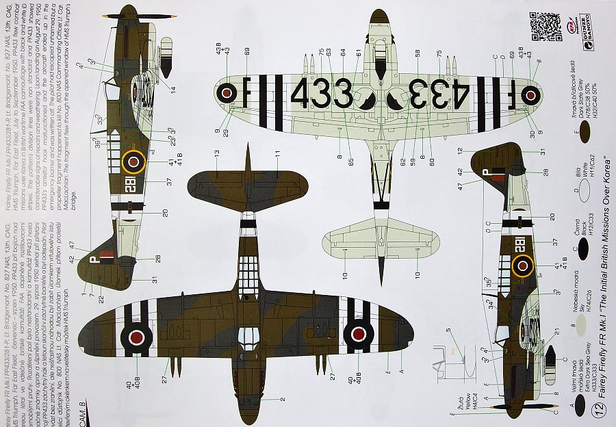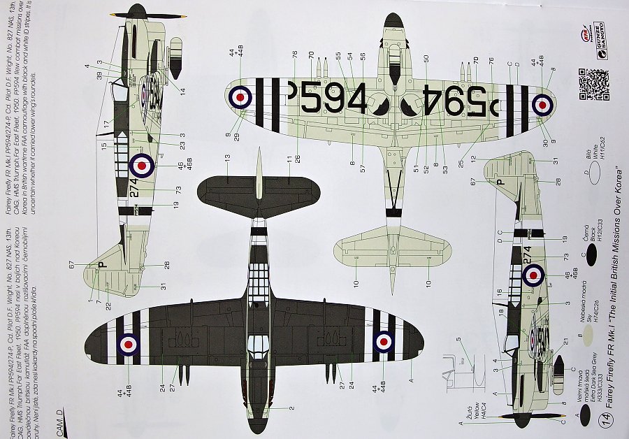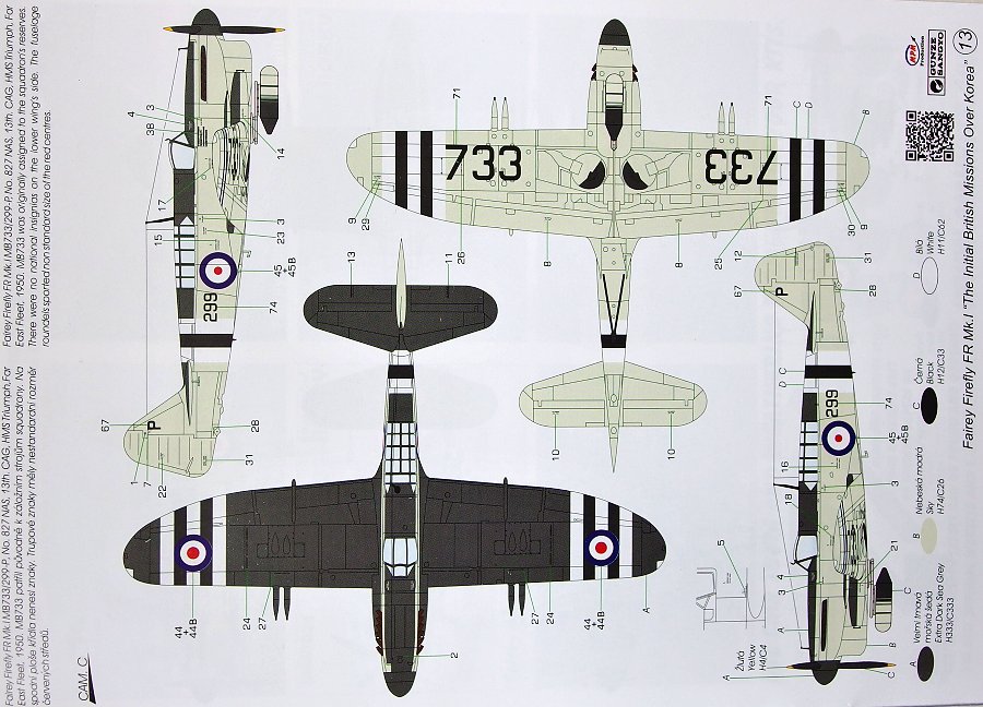 Special Hobby - 1/48 Scale Fairey Firefly Fr Mk.I "The Initial British Missions Over Korea" Fairey Firefly Mk.I is a typical example of British naval fighter design. Even before the outbreak of the World War 2, Royal Navy asked for two seater long range aircraft designs. Nevertheless, the second crew member was a burden that deprived the performances of these machines. Firefly replaced its low performance Fairey Fulmar predecessor and even though its design handicap was able to oppose the enemy fighters. Faa begun to receive US naval fighters at the time Firefly was approved for active service. Firefly became the complement of the fighters delivered from Usa and British Seafire fighters onboard Royal Navy aircraft carriers. Firefly fighters were deployed in Atlantic Ocean and also against Japan in Indian and Pacific Oceans. These became the first British aircraft to reach Japanese mainland and even Tokyo during World War 2. Fireflies together with Seafire Mk.47s became the first aircraft to participate in the Korean War. In the very beginning of this conflict British Far East Fleet's Hms Triumph joined US Navy fleet and her Fireflies were immediately deployed in attacks against North Korean Communists' ground targets. Mainly thanks to their four cannons and versatility of the external weapons' storage they proved to be more than well suited for this role. The kit of this version contains four sprues with grey plastic parts, injected clear sprue and resin parts. Decals included offer markings for four machines that operated from Hms Triumph. All of them sport friend or foe black and white Id stripes. Three machines feature typical post war British camouflage; the fourth one is of note due to its wartime camouflage and older type roundels.
