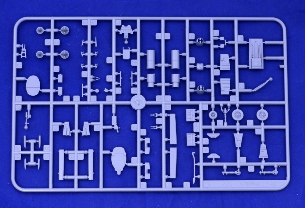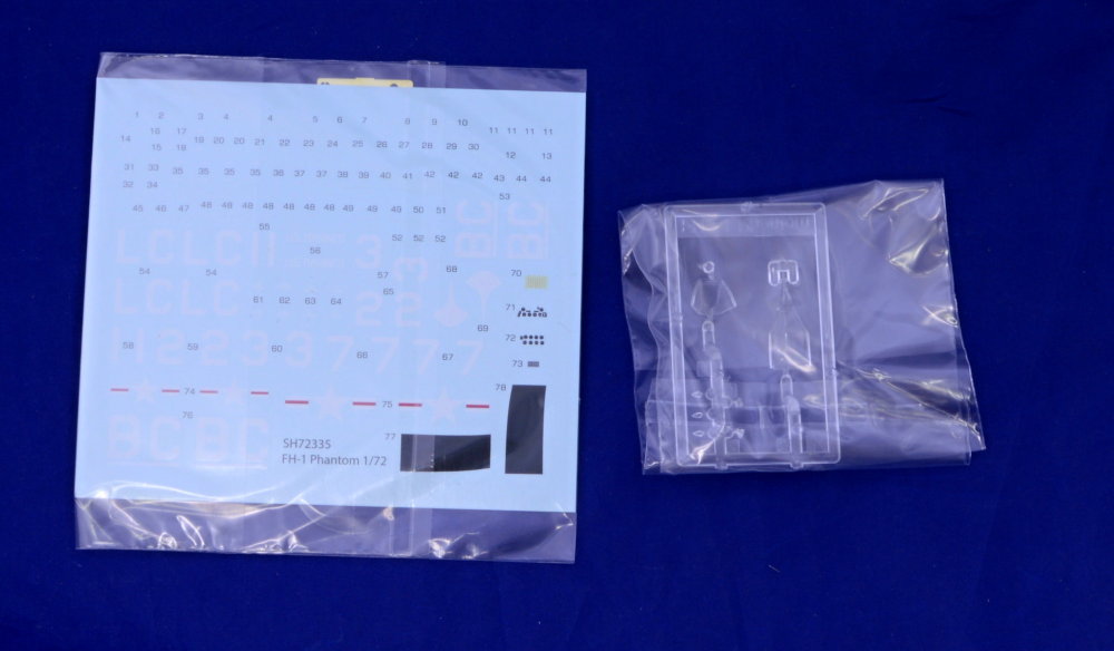 Contents of the box: three grey styrene, injection moulded sprues, one clear styrene sprue with canopy parts, sheet of decals and full colour instructions. The decals bring markings for four US Marines machines.