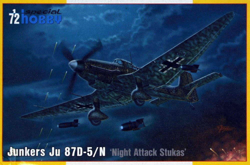 Special Hobby - 1/72 Junkers Ju-87D-5/N 'Night Attack 'Stuka' High quality Academy Junkers Ju 87G-2 styrene parts are now joined by our own designed and made styrene conversion parts, etches and resin parts, all of which gives you the very welcomed opportunity to turn the original Academy kit into the D-5/N/D-8 varieties. And at the same time, those new styrene parts also correct the very few mistakes which can be found in the kit. This version, which was effectively the very last bomber version of the Stuka, was first put into the service in 1943 and remained in use well until the end of the war, flying not only with the Luftwaffe, but with other Axis forces, too. And as the Allies enjoyed their air superiority in those latter war years, the Stukas were maainly operated at night both in the ground attack and bomber roles. These operations did not require dive brakes and these were usually removed, and a pair of exhaust dampers was also fitted.