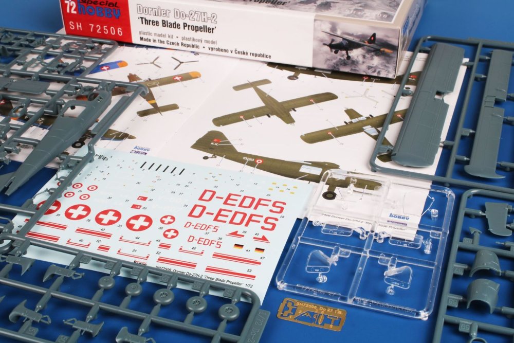 Special Hobby - 1/72 Dornier Do-27H-2 'Three Blade Propeller' This kit, besides the standard styrene parts, contains also a decal sheet with markings for three Do-27 airframes, these two, Swiss and Turkish, saw military service, while the last one flew in civilian hands in Germany. All three options are of the Do 27A-4/H-2 variety fitted with a three bladed propeller. Nicely detailed styrene parts offer modellers the option to build the kit with either open or closed cockpit and cabin doors.