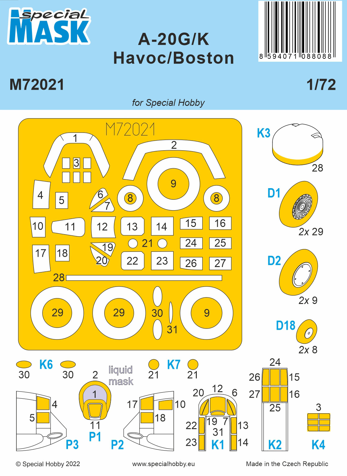Special Hobby - 1/72 Douglas A-20G/K Havoc/Boston Mk.IV Mask (for MPM, Revell and Special Hobby kits) Pre-cut paint masks for the clear parts and undercarriage wheels of the A-20 of late series which were fitted with a gun turret.