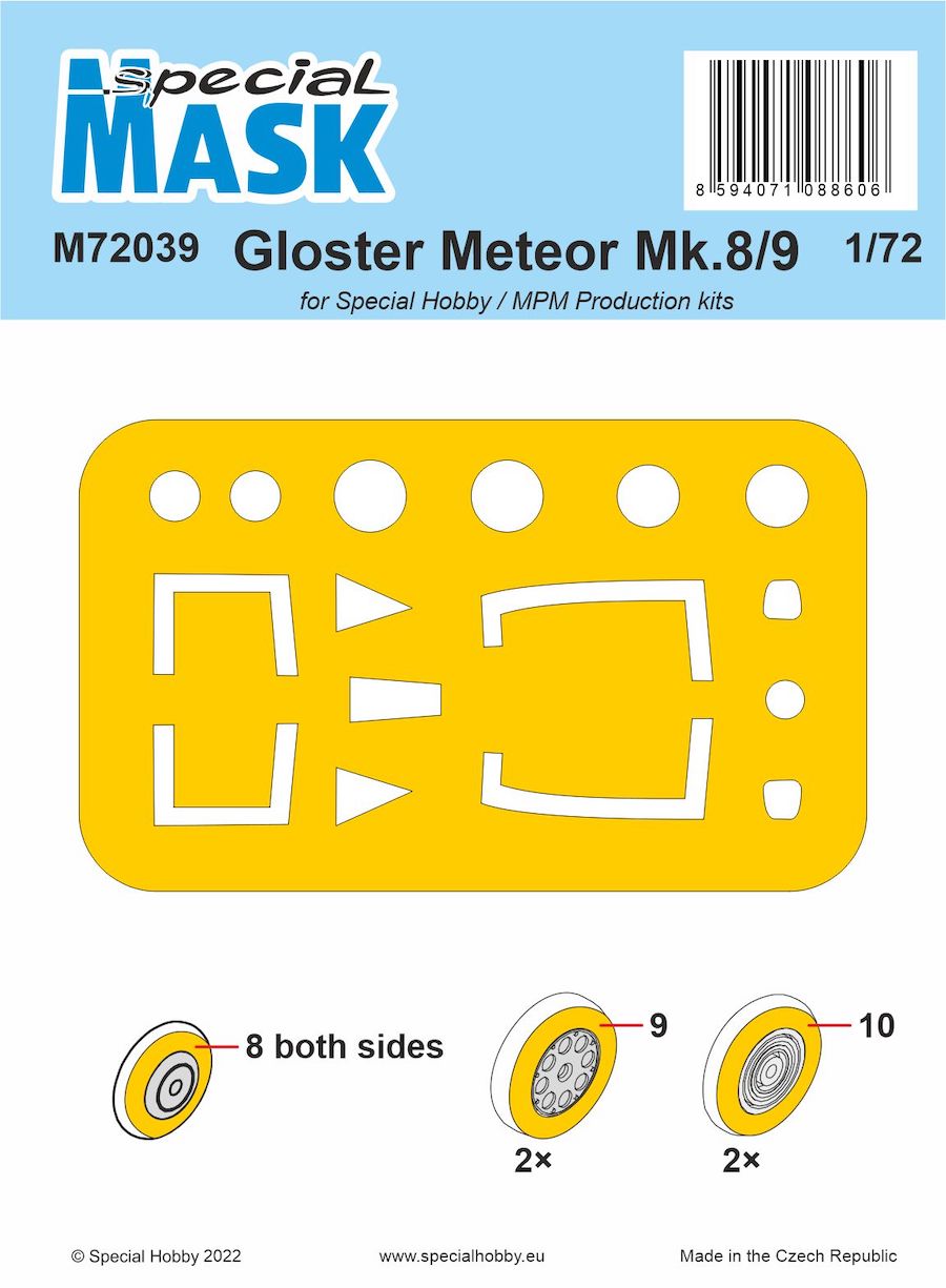Special Hobby - 1/72 Gloster Meteor Mk.8/Mk.9 Mask (for Special Hobby kits) Set of pre-cut painting masks for the canopy and wheels of Special Hobby's Meteor Mk.8/9 kits. Contains masks for both styles of the canopy hood as well as the nose camera ports of the FR.9 type.