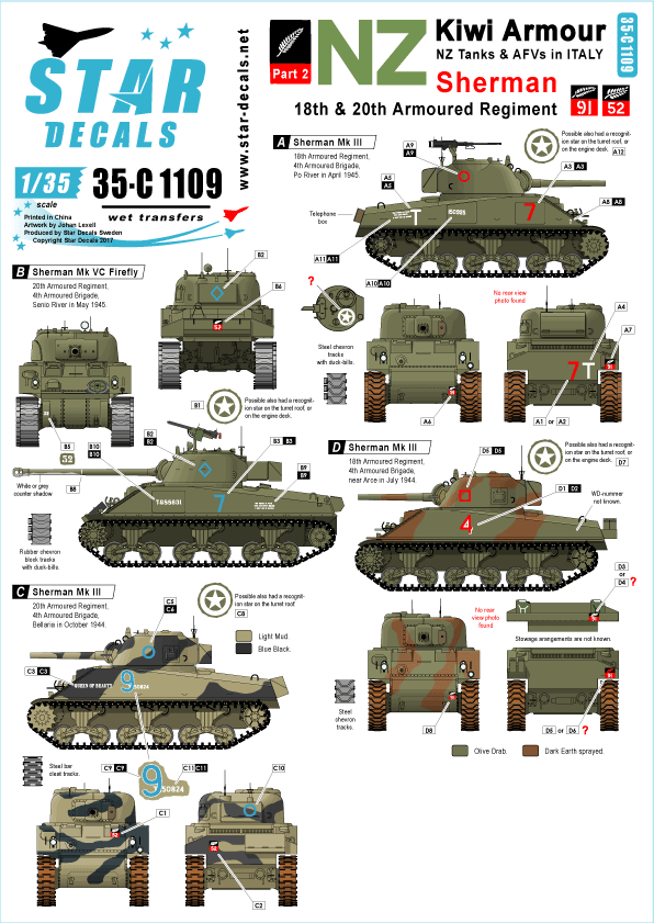 Star Decals - 1/35 Kiwi Armour Part 2. Sherman Mk.III/Mk.VC s & Firefly - NZ 18th and 20th Arm. Reg.