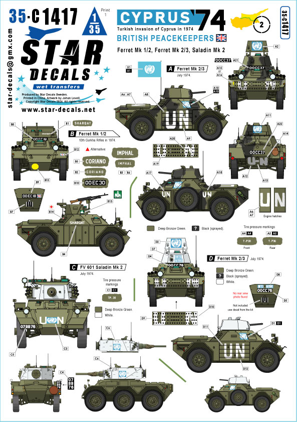 Star Decals - 1/35 Cyprus 1974 Part 2. British Peacekeepers. Ferret Mk 1/2, Ferret Mk 2/3, Saladin Mk 2. Turkish invasion in summer 1974.